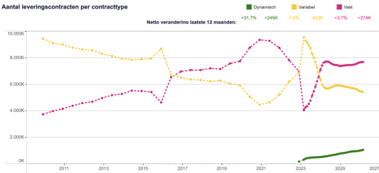 Het aantal Nederlandse huishoudens met een dynamisch energiecontract heeft in maart 2026 de grens van één miljoen aansluitingen overschreden. Dat blijkt uit data van de ACM Energiemonitor, geanalyseerd door energieleverancier NextEnergy. Van die aansluitingen betreft ongeveer 60 procent elektriciteit en 40 procent gas.